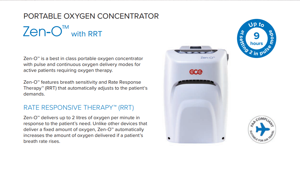 • ھو أفضل مُكثّف أكسجين محمول في فئته مع أوضاع توصيل Zen-O النبض والأكسجين المستمر للمرضى النشطين الذين يحتاجون إلى العلاج بالأكسجين. الذي )RRT( بدقة استشعار النفس ومعدل الاستجابة للعلاج Zen-O يتميز يتكيف تلقائياً مع متطلبات المريض.